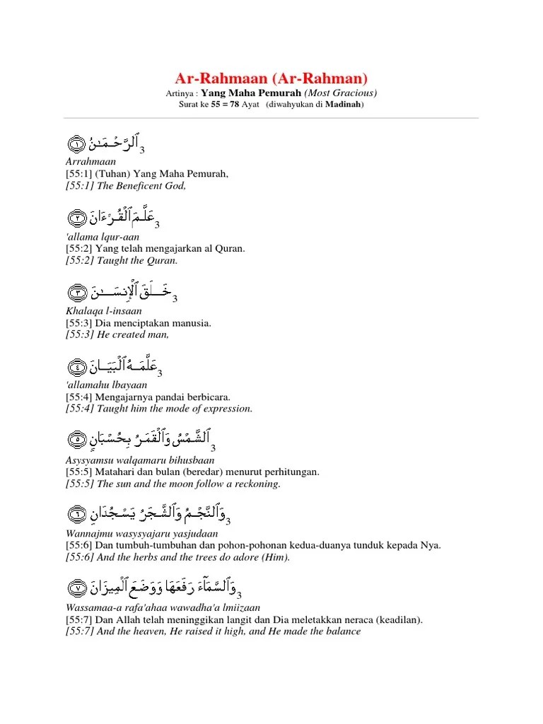 Surah ar rahman disertai text bahasa arab beserta artinya dalam bahasa indonesia dan bahasa inggris.terjemahan ditulis secara 'ilmiah' tidak .